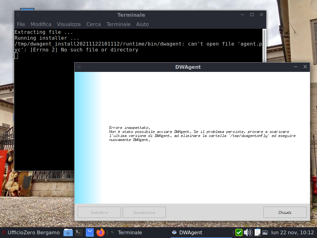 il tool dwagent sulla Bergamo 3.1.6 e sulla nuova non va in esecuzione a causa dell'errore che ti allego come screenshot.